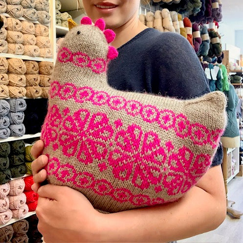 Fancy Hen is knit from the bottom up. Her comb sections and beak are knit separately and sewn on. With the addition of a few large pebbles at the base, Fancy Hen could make an ideal doorstop or bookend. Otherwise keep her soft for use as a cushion or toy.