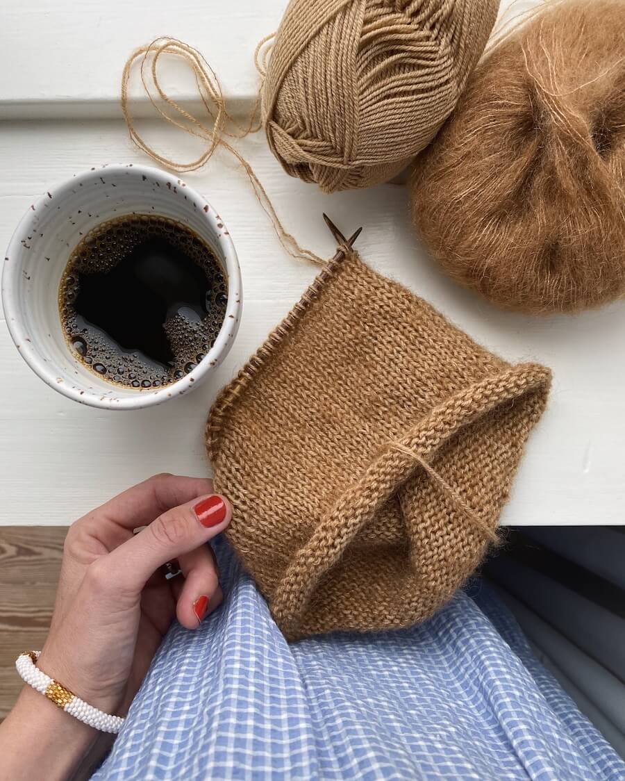 The golden Baggy Hat is knitted in Sunday by Sandnes Garn in the color Camel [2542] held together with Tynn Silk Mohair by Sandnes Garn in color Brunt sukker [2543].