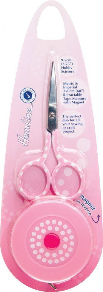 The perfect duo for all sewing and craft projects! These quality stainless steel polka dot scissors and co-ordinating metric and imperial 250cm tape measure. The tape measure has a handy magnet on the back for easy storage or to keep your sewing needle safe while you work. The scissor blades are 9.5cm which means they are usually permitted in carry on luggage with most airlines.