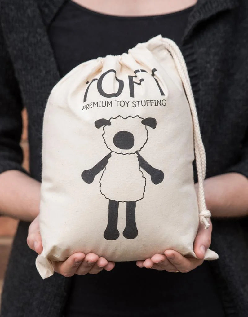 TOFT’s Premium Toy Stuffing comes in a drawstring bag and contains 150g of Hi-Loft Polyester toy stuffing. That's enough stuffing for 5 standard (DK) animals, or 1 large (Aran) animal. You'll need 2 bags for a giant (Chunky) animal.