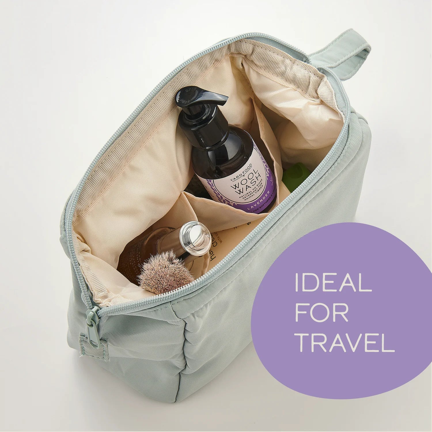 PERFECT TRAVEL DETERGENT Made to fit in your wash bag, just add 3 pumps of Yarn Food Wool Wash to a water-filled sink wherever you are, leave 20 minutes to soak, squeeze out water, lay out flat or hang to dry. No machine or effort needed. You’re on holidays after all.